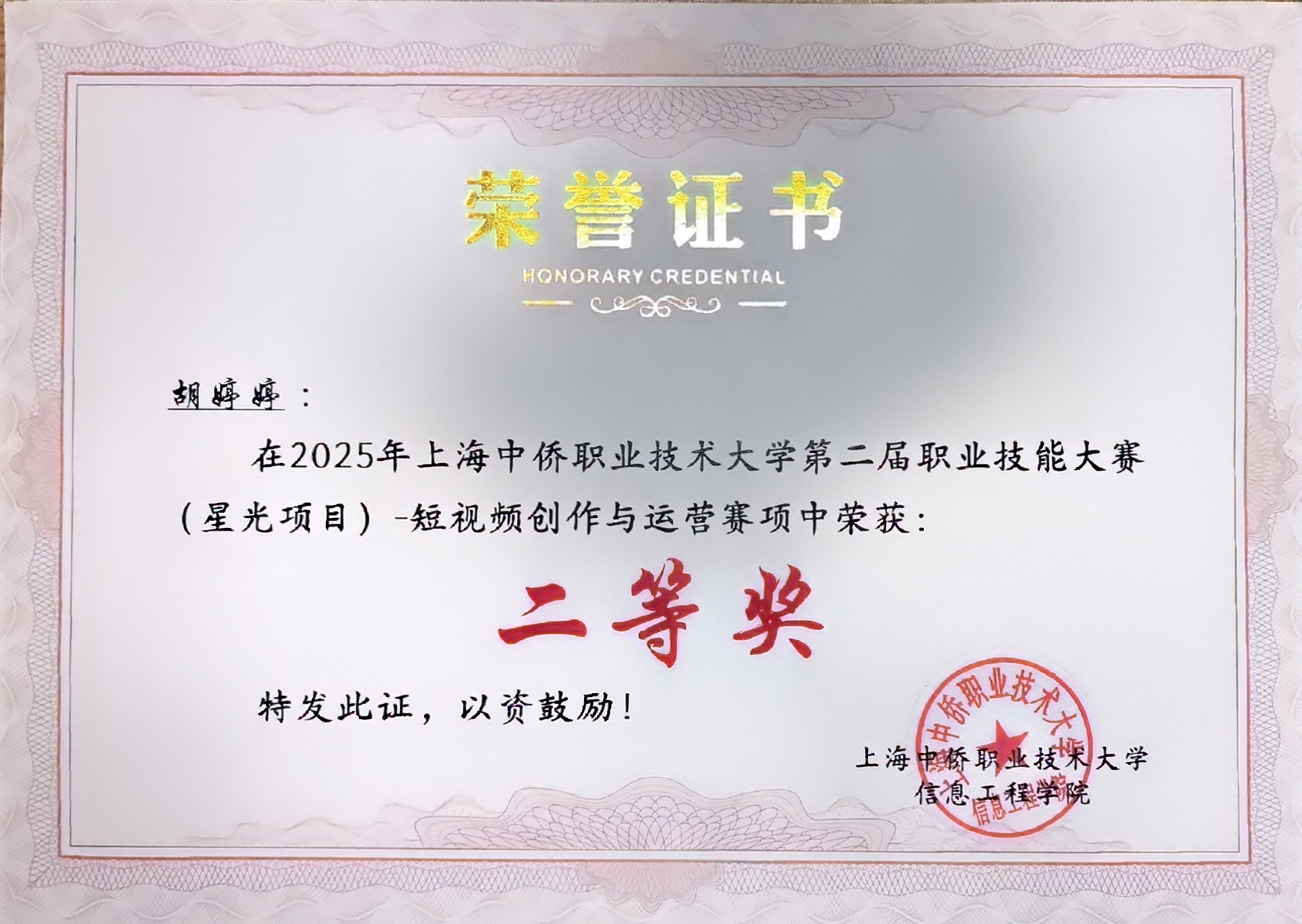 除以上奖项之外,该同学还获得以下荣誉:1.2023年“校训、校歌、校赋”主题征文比赛二等奖;2.第九届“知网杯”上海高校信息资源发现大赛初赛个人二等奖;3.2023届“中国好书法”三等奖;4.全国计算机等级考试一级合格证书;5.汉字应用水平测试三级证书;6.2024年上海市大学生社区创课大赛中荣获:潜力创课奖;7.上海张堰文教科创园遇见“1949”摄影大赛三等奖;8.上海中侨职业技术大学首届“大学生讲思政课”和“我心中的思政课”微电影比赛一等奖;9.2025年上海中侨职业技术大学第二届职业技能大赛(星光计划)-短视频创作与运营赛项二等奖;10.Har monyOS应用开发基础认证。