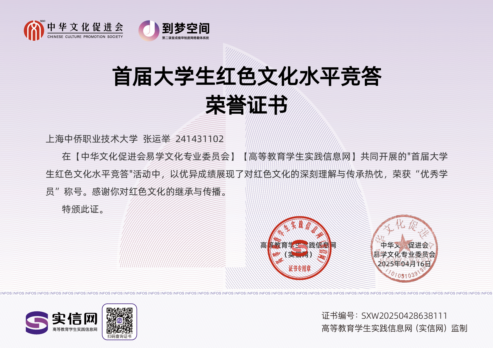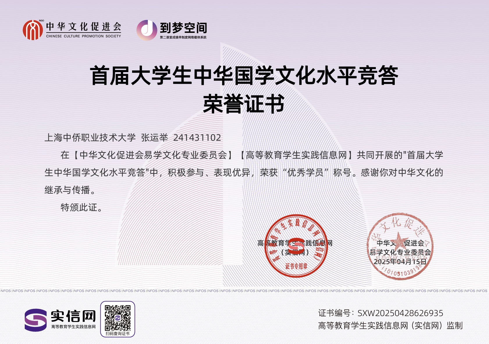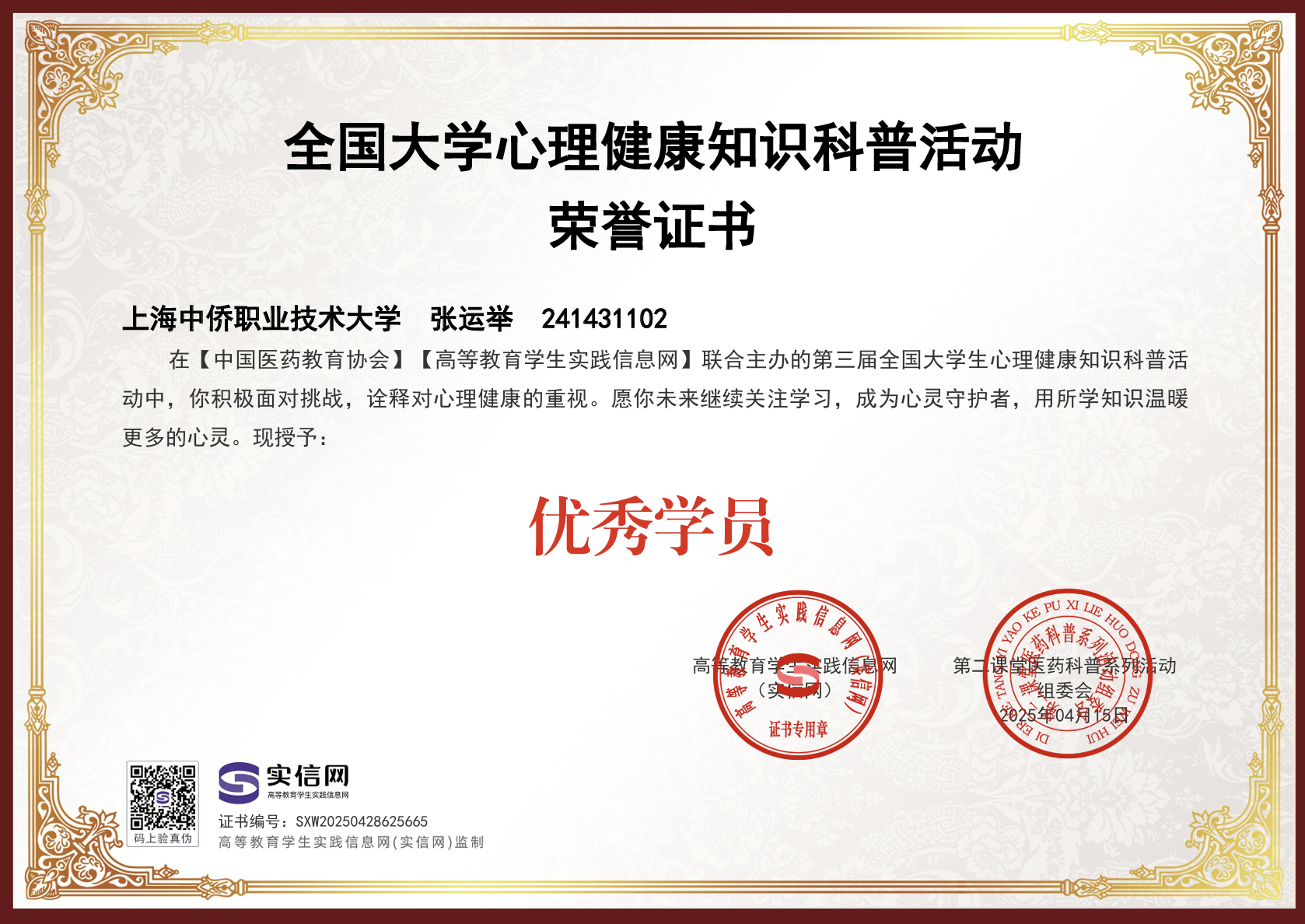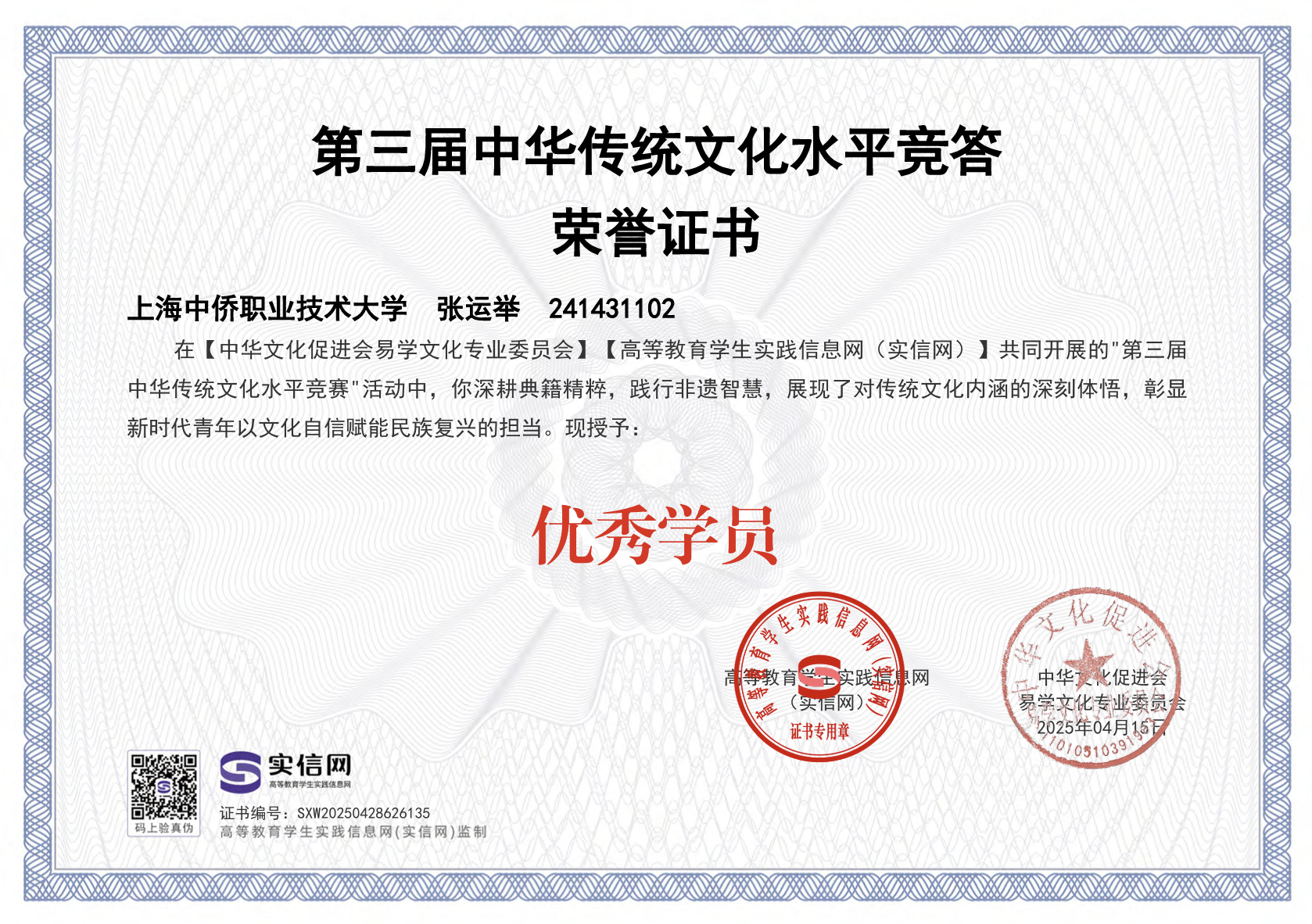 自入团以来,张运举始终以高度的责任感履行团员义务,在思想引领、团务工作、学业精进、志愿服务等方面表现突出,展现了新时代共青团员的青春担当。