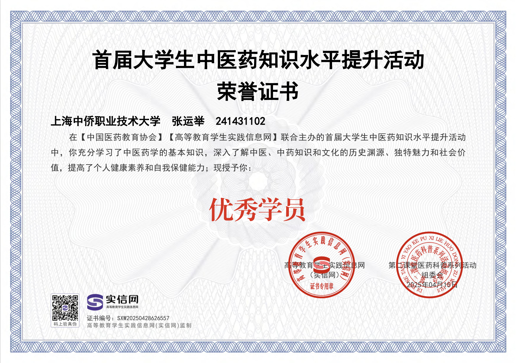 张运举积极向党组织靠拢,现为第二分党校第十七期入党积极分子培训班学员。他始终以习近平新时代中国特色社会主义思想为指导,积极参与“青年大学习”网上主题团课学习,目前累计积分已达1408分。组织团支部开展“党的二十大精神专题学习会”,覆盖全体团员。2025年,他以志愿者身份参观中共一大会址纪念馆,通过实地学习深化对党的初心使命的理解。