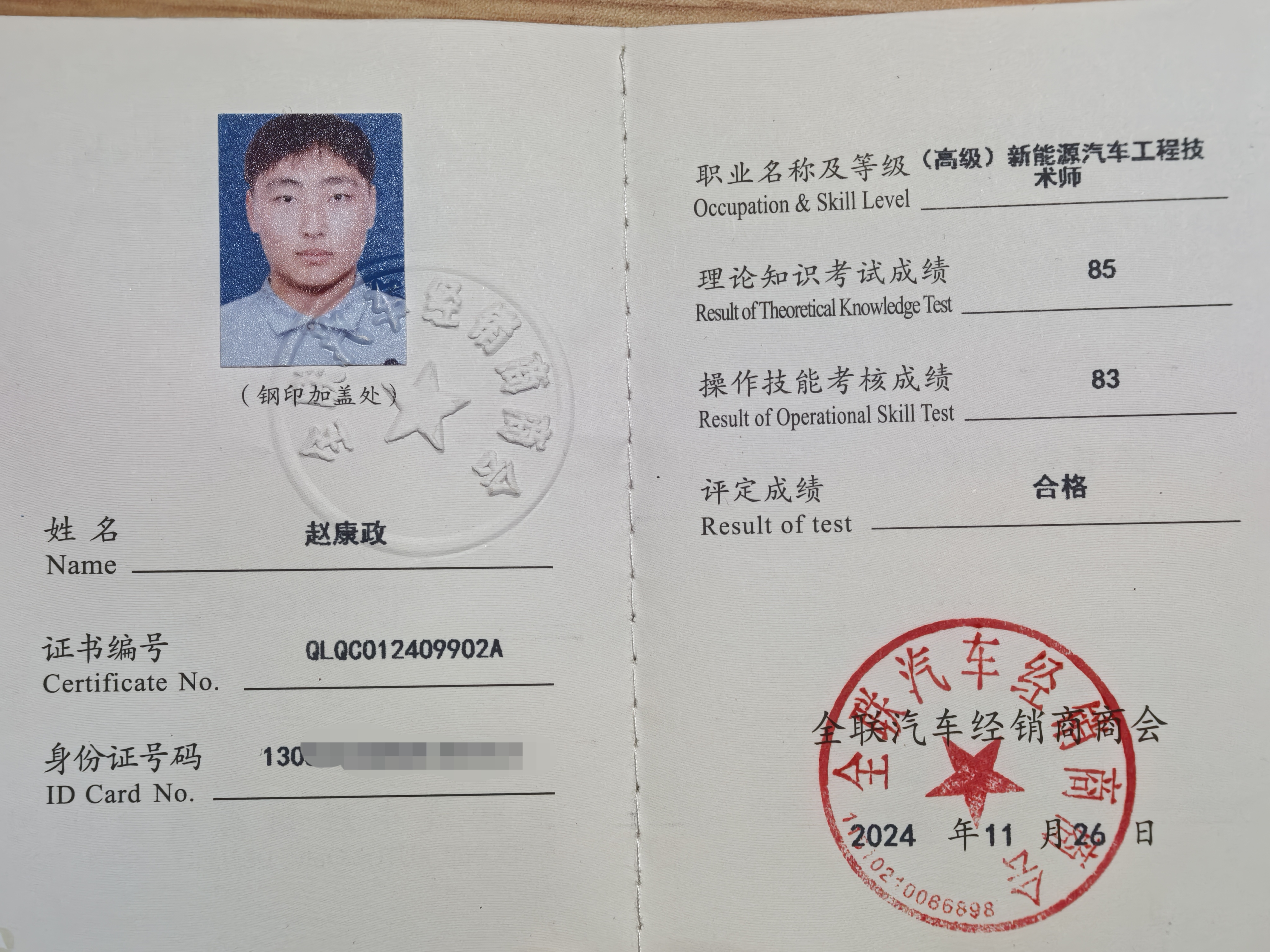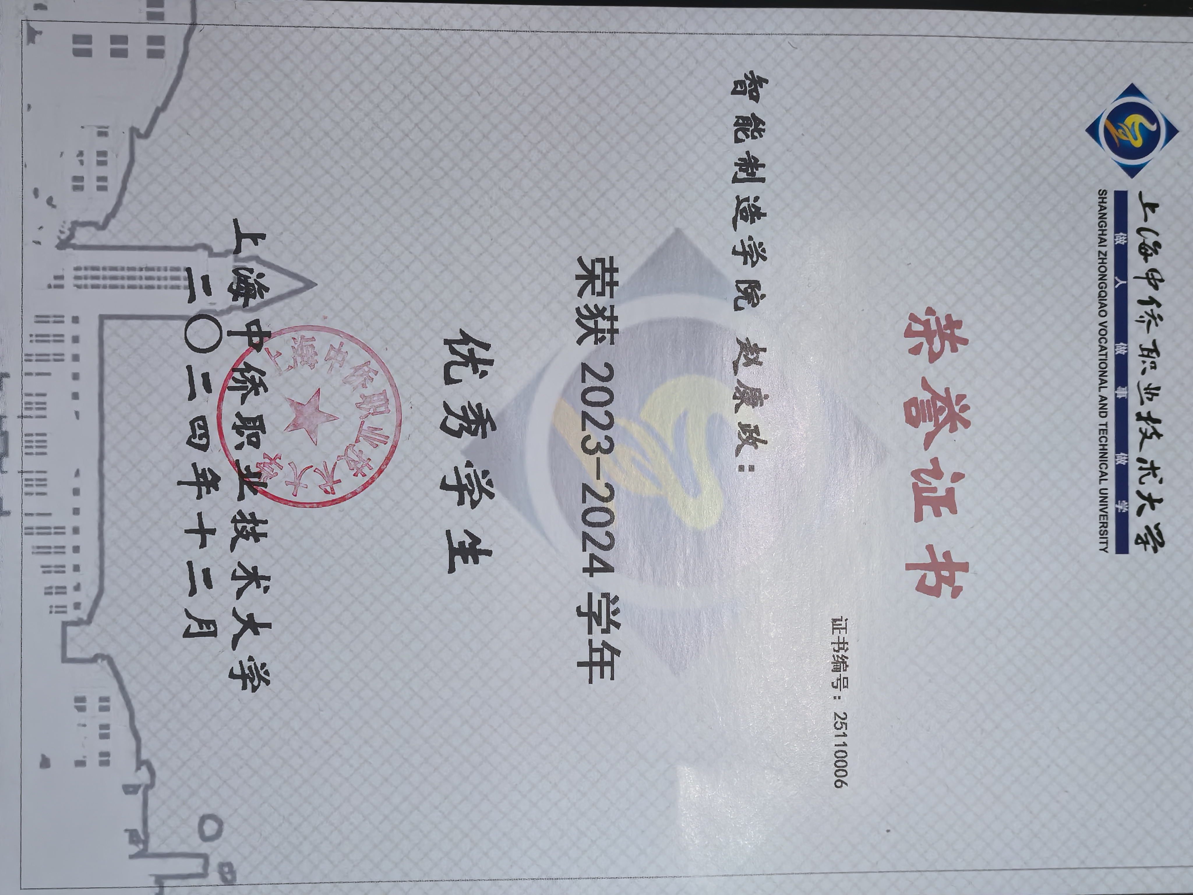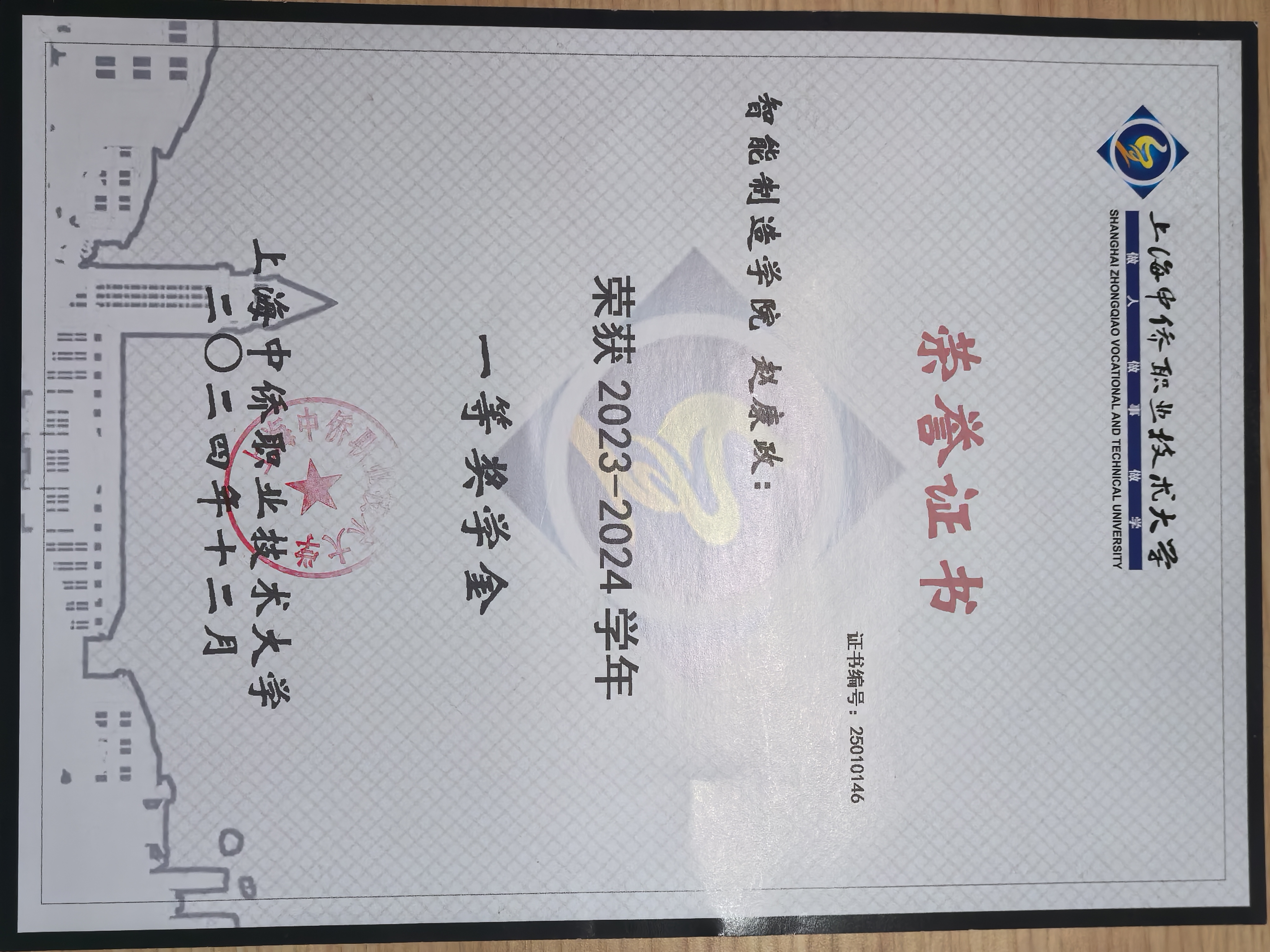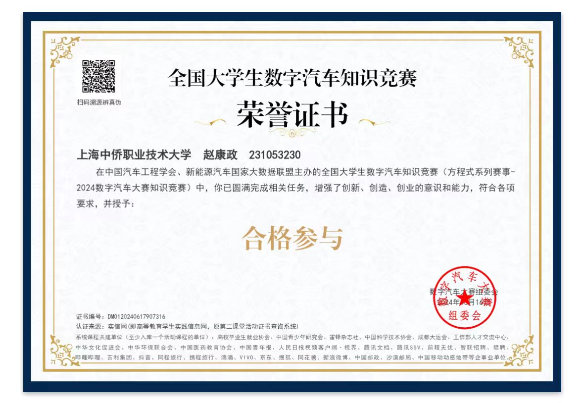 赵康政同学在学术追求上展现出了卓越的严谨态度和不懈的努力精神。他深刻认识到学习的至关重要性,因此精心制定了详尽的学生生涯规划,并设定了明确的学习目标。对于每一节课,他都怀有敬畏之心,从不迟到、早退或缺席。课后作业更是按时完成。面对学习中的难题,他勇于与教师进行深入沟通探讨,追求真知。他对专业知识的掌握尤为扎实,定期对知识点进行系统整理。同时,他不断自我提升,力求在学业上取得优异成绩。这种努力和毅力使他在期末考试中取得了显著进步,实现了无挂科记录的成就。在2023-2024学年中,他荣获了校级“一等奖学金”的殊荣。此外,赵康政同学并不满足于现有的学术成就,而是积极参与各类竞赛活动。在2024年全国高校汽车行业新技术应用技能竞赛暨全国大学生汽车智慧云双创大赛中斩获一等奖,同时在学校的汽车维修大赛中获得三等奖;同年,在第九届“复旦社杯”大学生学术英语词汇赛中荣获优胜奖;2025年,在上海中侨职业技术大学汽车检修比赛中获得三等奖;他还取得了高级新能源汽车工程技术师的资格证书。此外,他在2024年第九届数维杯大学生数学建模挑战赛中荣获“优秀奖”,并在第十届数维杯大学生数学建模挑战赛中获得“successful participant”。这些成就充分展现了他在学术领域的卓越才能和全面素质。