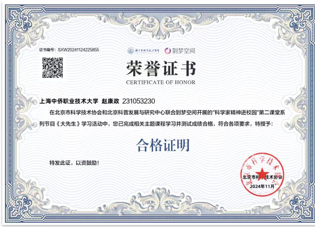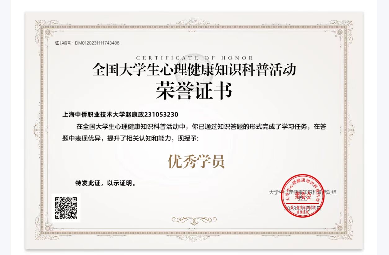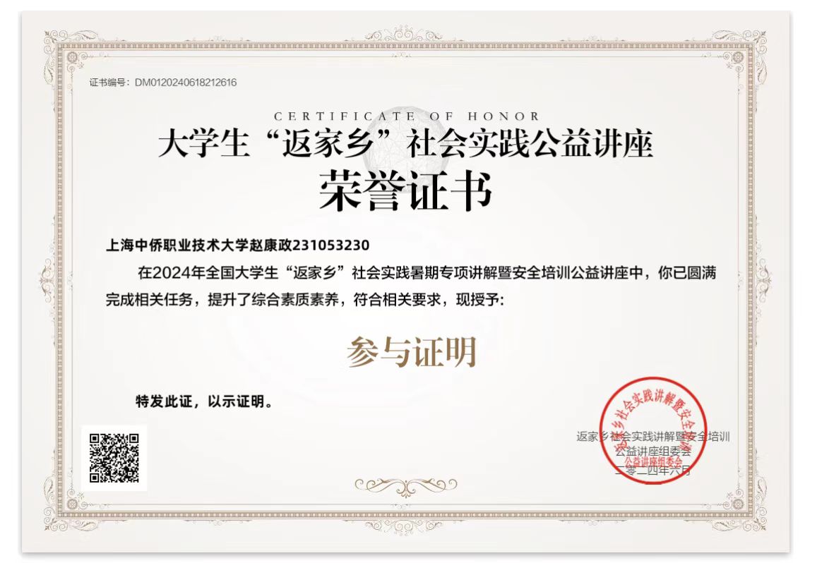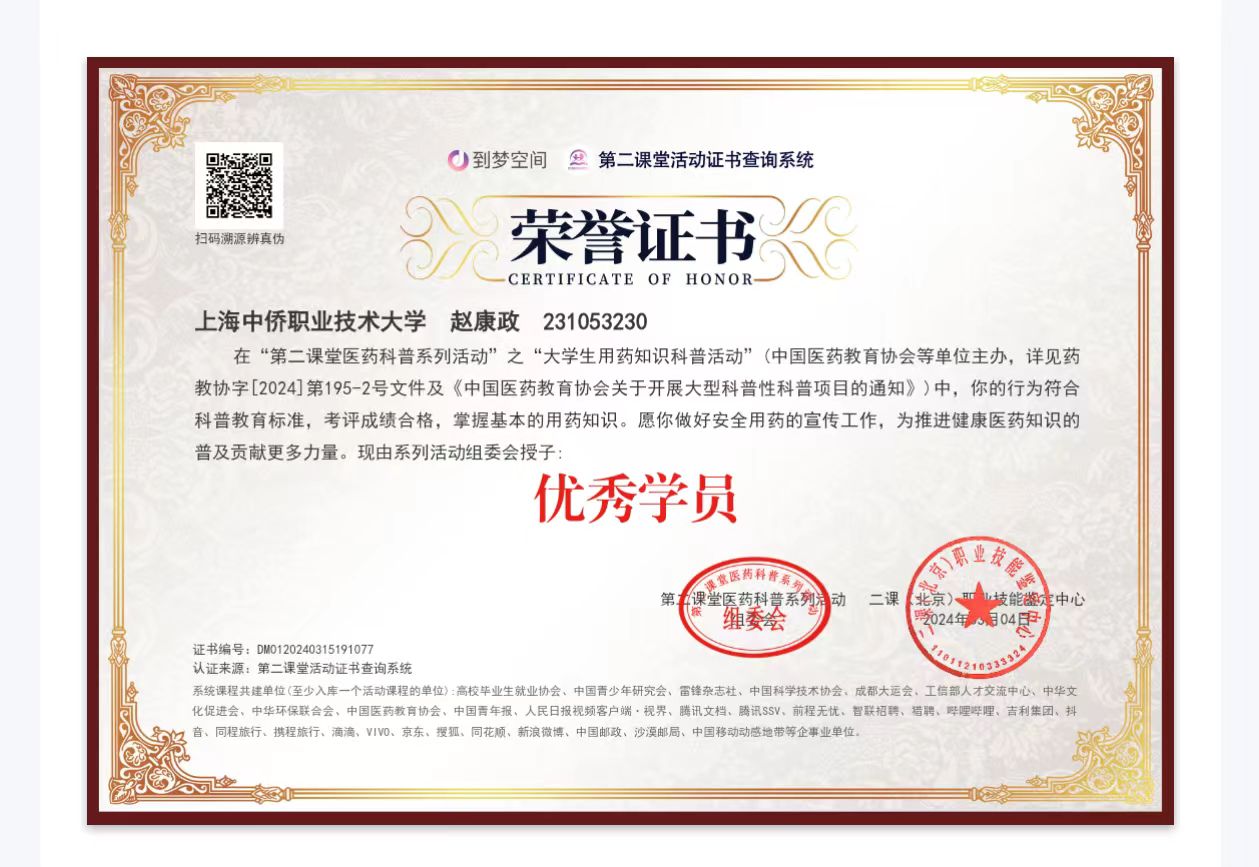 赵康政同学在学术追求上展现出了卓越的严谨态度和不懈的努力精神。他深刻认识到学习的至关重要性,因此精心制定了详尽的学生生涯规划,并设定了明确的学习目标。对于每一节课,他都怀有敬畏之心,从不迟到、早退或缺席。课后作业更是按时完成。面对学习中的难题,他勇于与教师进行深入沟通探讨,追求真知。他对专业知识的掌握尤为扎实,定期对知识点进行系统整理。同时,他不断自我提升,力求在学业上取得优异成绩。这种努力和毅力使他在期末考试中取得了显著进步,实现了无挂科记录的成就。在2023-2024学年中,他荣获了校级“一等奖学金”的殊荣。此外,赵康政同学并不满足于现有的学术成就,而是积极参与各类竞赛活动。在2024年全国高校汽车行业新技术应用技能竞赛暨全国大学生汽车智慧云双创大赛中斩获一等奖,同时在学校的汽车维修大赛中获得三等奖;同年,在第九届“复旦社杯”大学生学术英语词汇赛中荣获优胜奖;2025年,在上海中侨职业技术大学汽车检修比赛中获得三等奖;他还取得了高级新能源汽车工程技术师的资格证书。此外,他在2024年第九届数维杯大学生数学建模挑战赛中荣获“优秀奖”,并在第十届数维杯大学生数学建模挑战赛中获得“successful participant”。这些成就充分展现了他在学术领域的卓越才能和全面素质。