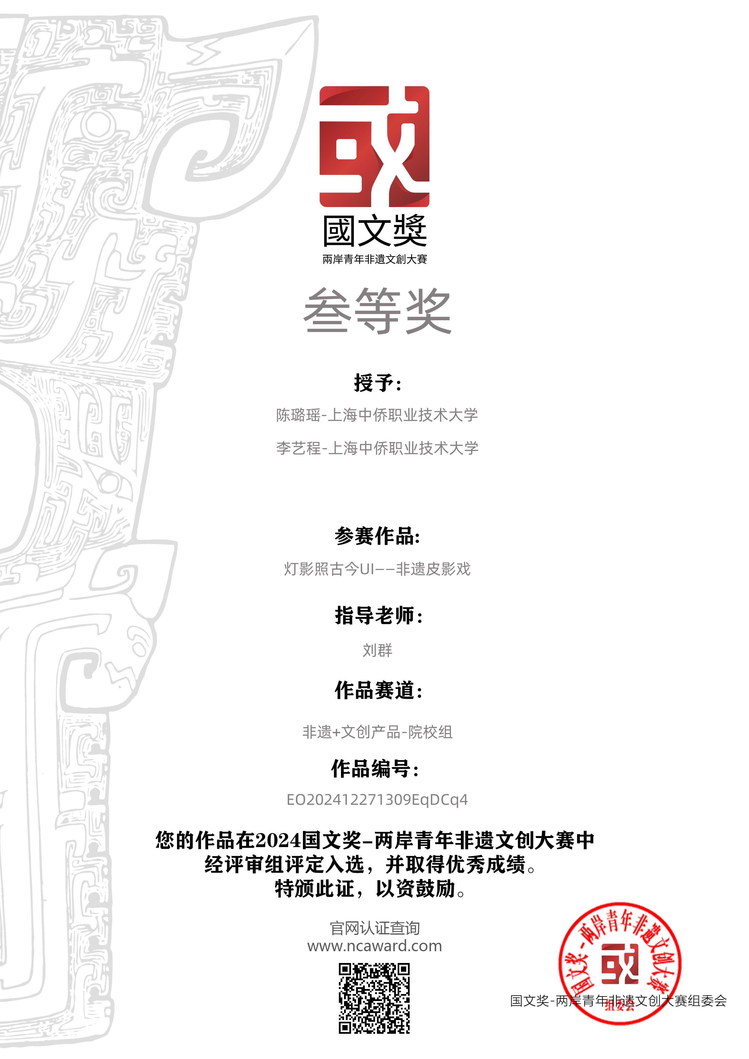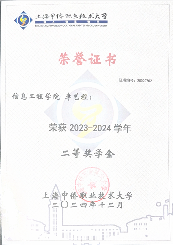 除此之外,他还深刻认识到升学的重要性,于今年3月份参加全国计算机等级考试。在学好专业技能的同时,他力求从全方位不断提升自身的综合素质,积极参加各项比赛,曾获得2024年澳门文创设计大赛全国三等奖,2024年国文奖两岸青年非遗文创大赛三等奖,2024年“知行杯”上海市大学生社会实践大赛乡村振兴赛道高职组三等奖(红色赋能项目),2024年“知行杯”上海市大学生社会实践大赛乡村振兴赛道高职组三等奖(数智兴农项目)等荣誉。