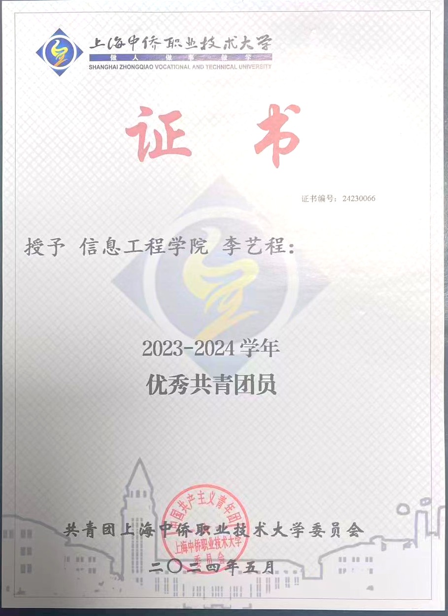自入学以来,李艺程同学一向以高标准严格要求自己。经过一年多的求学时光,在校、院领导及各位老师的悉心关怀、谆谆教导下,在同学们的无私帮助下,无论是思想工作还是学习生活上,李艺程同学都取得了很大的进步。目前,他在思想、学习、工作、实践方面均表现良好,故向组织申请评选“2024-2025学年校优秀青年技能能手”荣誉称号。以下为李艺程同学的具体情况: