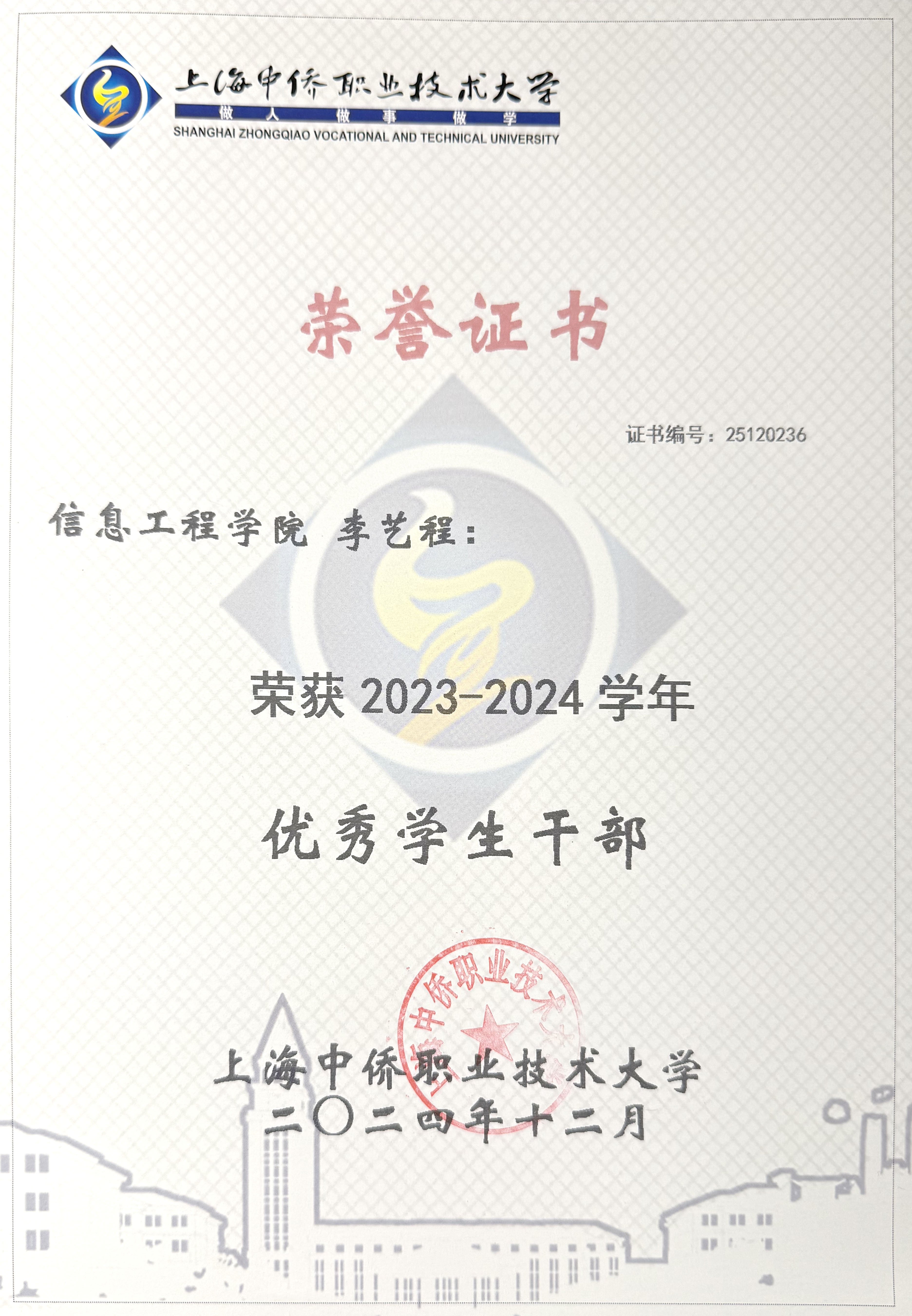 李艺程,男,汉族,是上海中侨职业技术大学信息工程学院23级数字媒体技术专业1班学生,现任班级班长,兼信息工程学院主席团成员职务。作为学生,李艺程同学有计划地学习专业知识,积极参加各种活动;作为学生干部,他团结同学,敬爱师长,深入细致的做好各项本职工作,是同学们的好榜样,老师的好帮手。