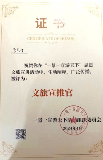 李艺程同学认为社会实践是大学生发展不可缺少的一部分。因此,每年他都会进行志愿服务,贡献自己的一份力量。李艺程同学于今年参加了叮咚买菜辅导员培训,并获得金山区青少年实践活动中心认证的上岗证书。在SEMICON China国际半导体博览会,担任志愿者组长。4月在“一景一宣游天下”志愿文旅宣讲活动文旅宣讲活动中,获宣推官证书。去年7月,他也积极参加学校的暑期桥牌志愿者活动,负责对接前来比赛的学校团队,并安排其接送、住宿工作。目前志愿汇志愿时长达48小时。