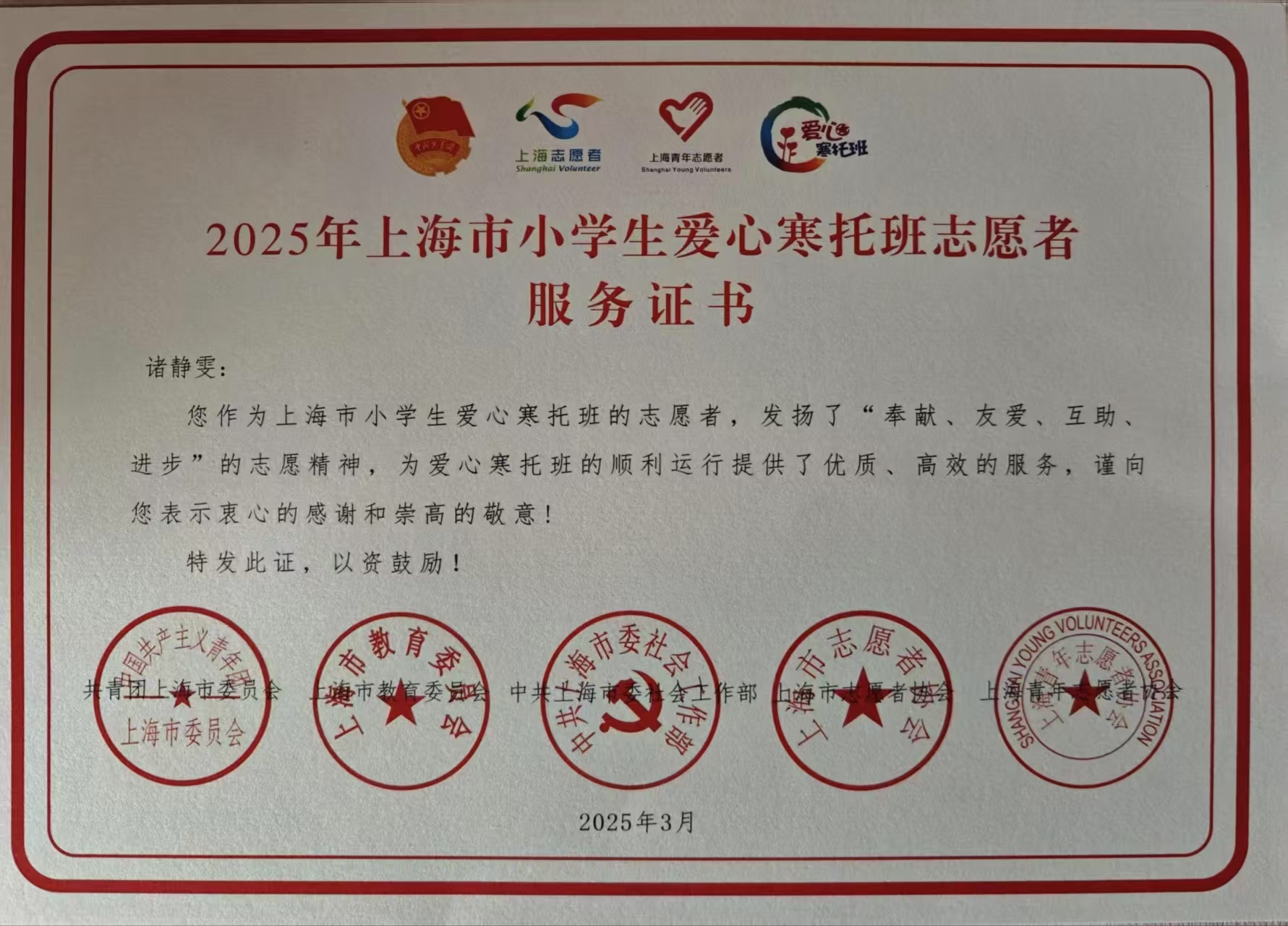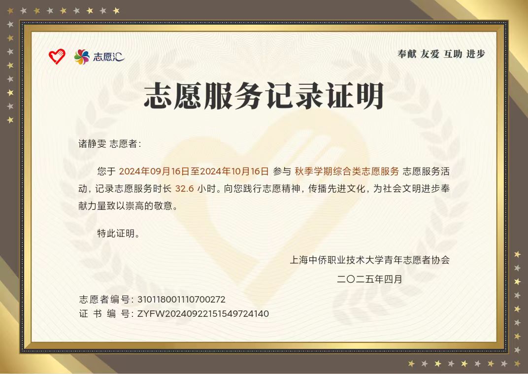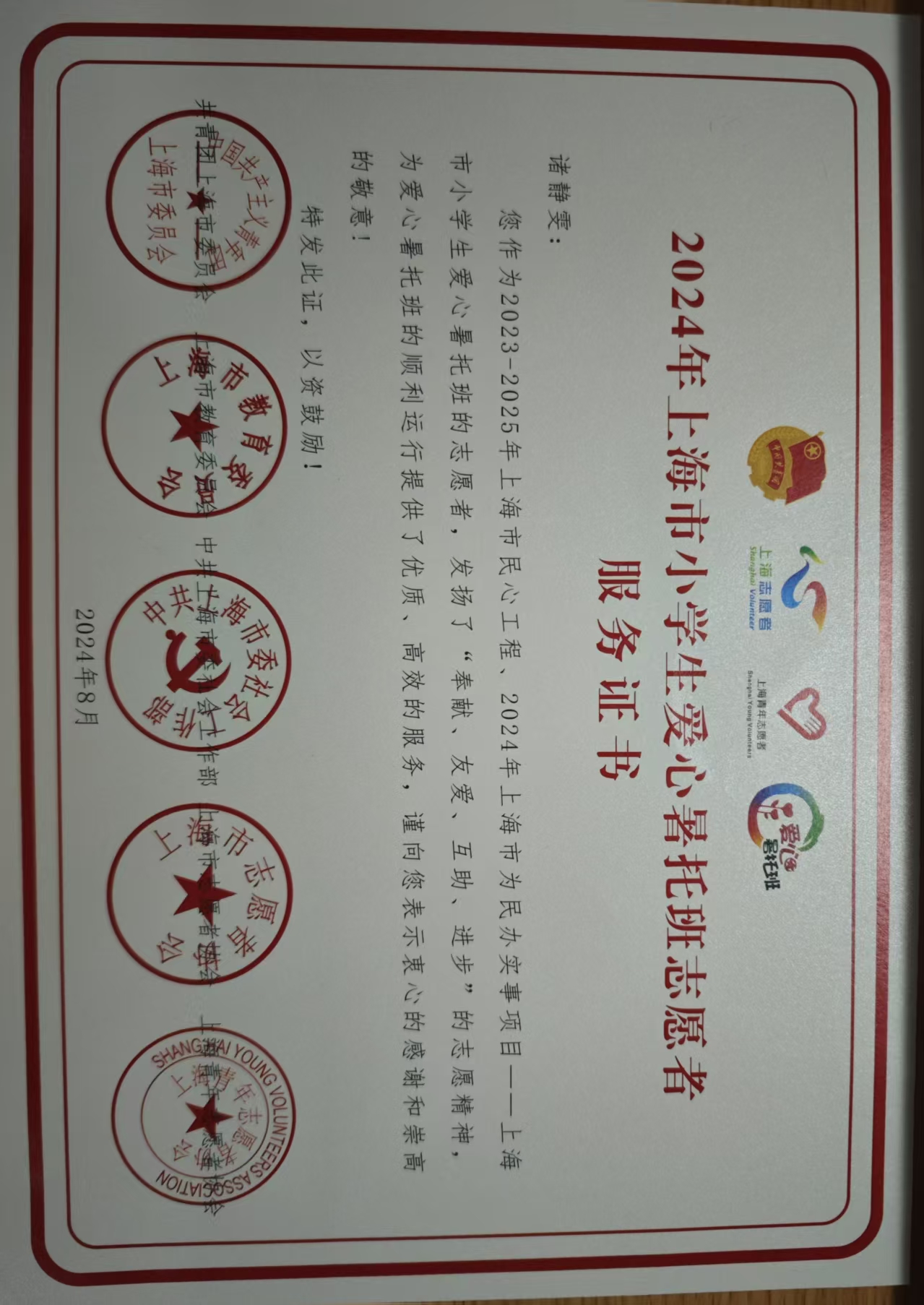 在课余,她往往将自己投身于各类志愿活动中,入校以来共参与过7项志愿活动,其中包括:2024四大洲花样滑冰锦标赛志愿、2024上海“湾区杯”击剑精英赛总决赛志愿者,上海自然博物馆志愿者,2024年上海爱心暑托班志愿者,2024秋季学期综合类志愿服务志愿者,2025年上海爱心寒托班志愿者。工作累计时长共318.82小时。她始终认为志愿服务以无数微光汇聚时代暖流,涵养主流价值、培养文明新风。