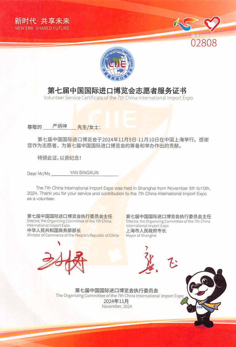 除了专注于学业和学生工作,他还积极参与志愿者服务活动。令他印象最为深刻的是参加第七届中国国际进口博览会的志愿服务活动。他很荣幸能以一年级“小叶子”的志愿者身份参与其中。他是志愿服务保障组的一员,他们的工作是为所有的“小叶子们”发放餐食,做好后勤服务工作,为所有“小叶子”保驾护航。这次的进博会志愿者之行使他受益匪浅,在这里他结识了许多同学伙伴,后勤保障的工作提高了他的小组协作能力和沟通能力,同时他也一览了展内最先进的前沿科技一饱眼福,在这里我度过了美好而又意义的一段时光。