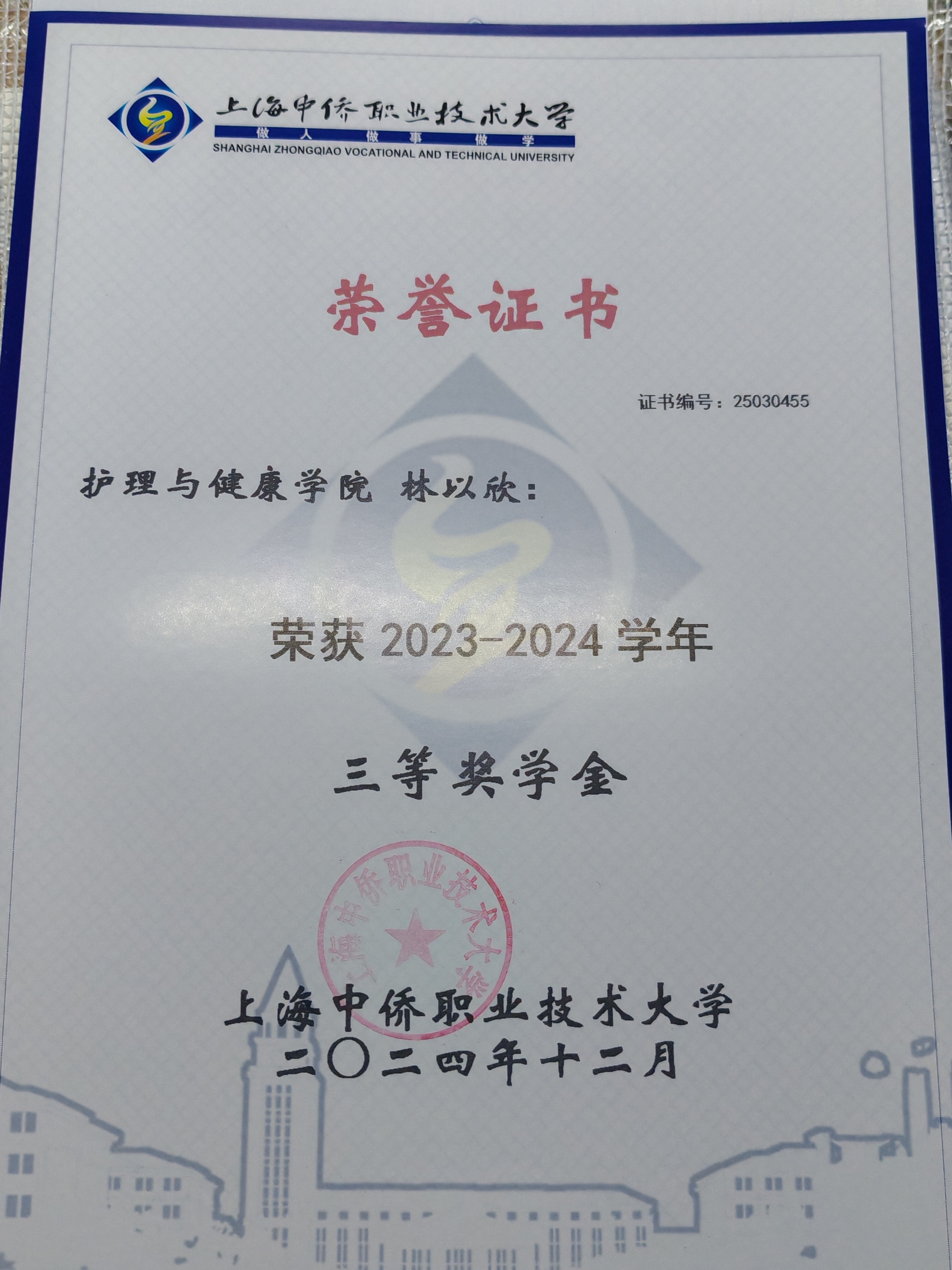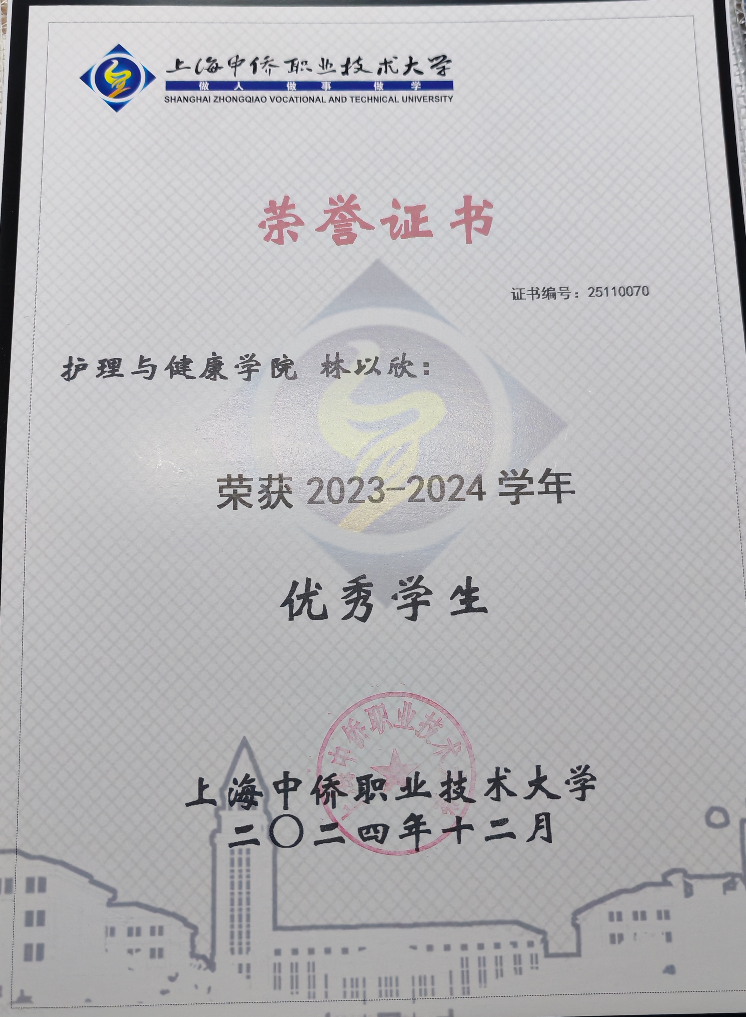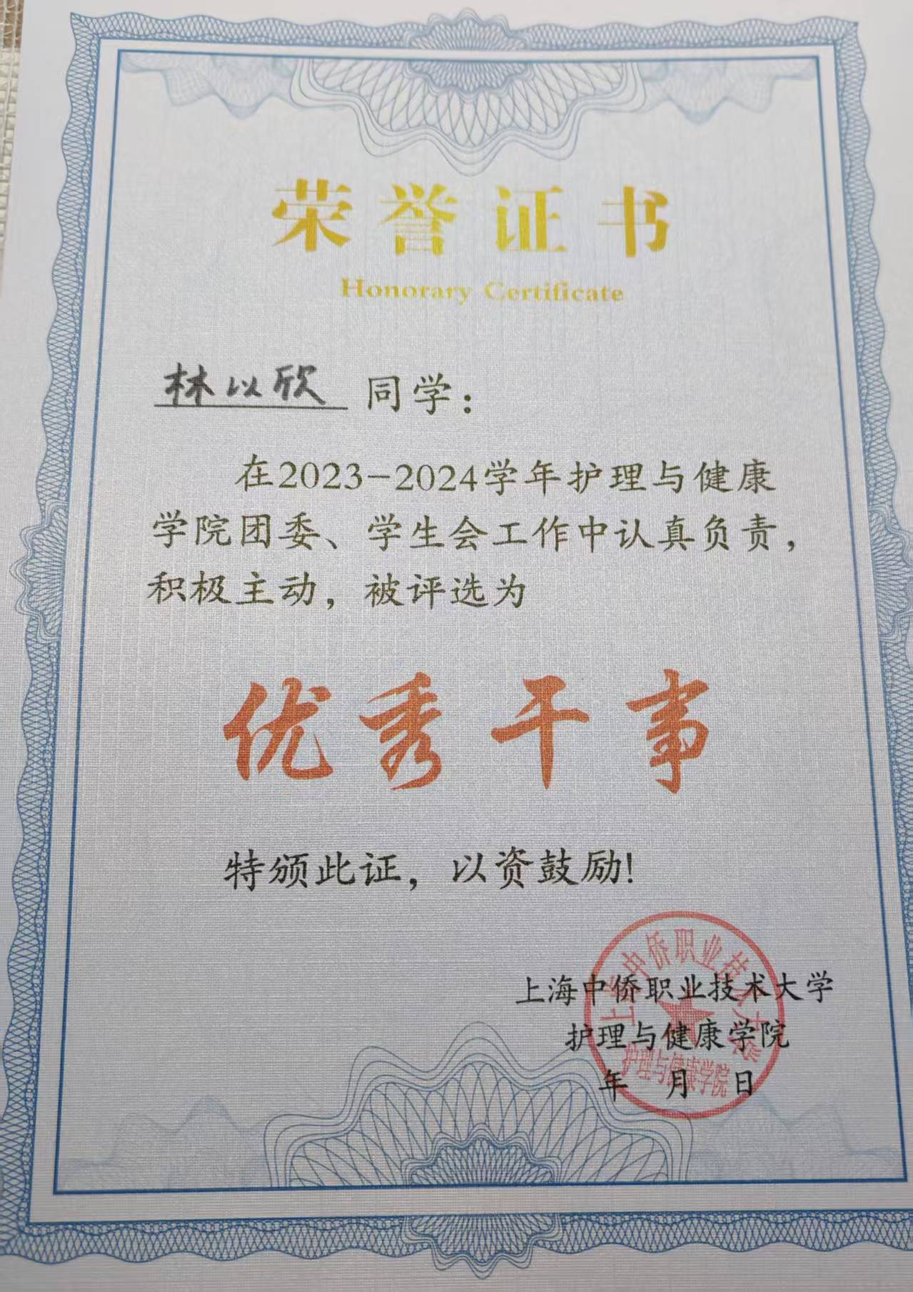 林以欣,上海中侨职业技术大学护理与健康学院23护理本科的一名优秀学生。她身兼班级的宣传委员,以及学院团委学生会宣传部副部长一职,在多个方面有着优秀表现,为同学们树立榜样,发挥了带头作用。