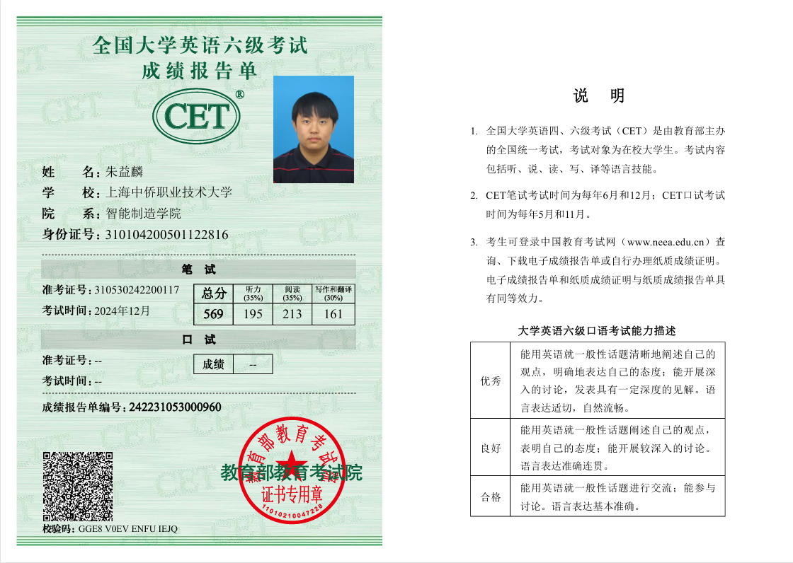 他以“做学”精神深耕专业学习之中,注重知行合一与全面发展。凭借科学的学习方法和持之以恒的努力,并高分通过大学英语六级考试,展现出优秀的语言应用能力与跨学科素养。面对智能制造领域的技术挑战,他主动构建“机械-控制-人工智能”跨学科知识体系,坚持“理论指导实践,实践反哺理论”的学习路径,在专业课程中始终保持前沿视野与创新思维。他注重知识共享,积极组织学习交流活动,带领同学攻克技术难点,以实际行动践行“独行快、众行远”的协作理念。