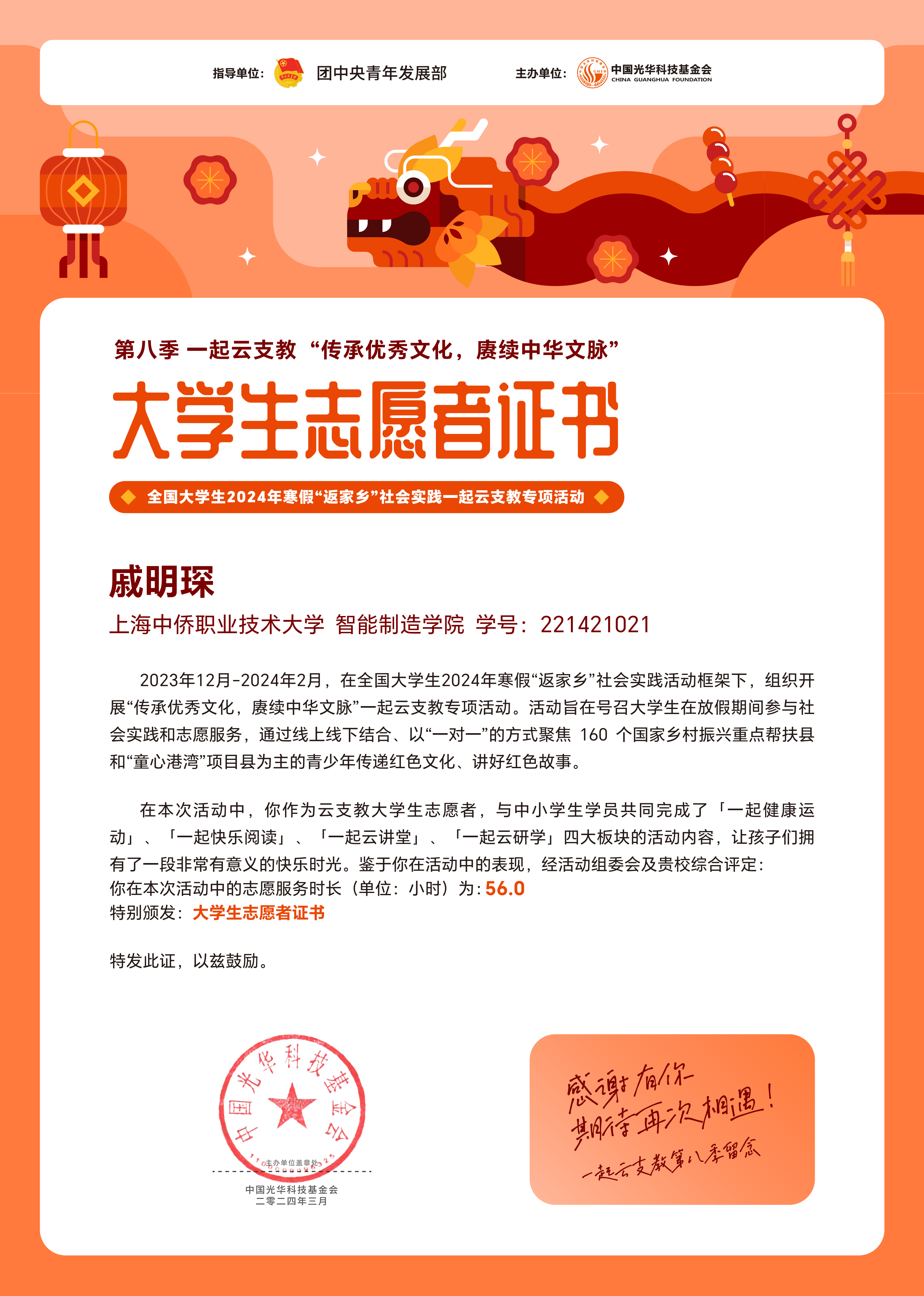 该同学在班级中积极帮助班干部处理班级事务,帮助班干部分担任务,在班级工作方面,我积极帮助班级发布团日活动和主题班会,多次参与班级团日活动工作,关注社会热点,认真负责,用积极乐观的心态对待工作与学习,为同学们答疑解惑。经常多次协助团支书组织委员等班干部完成团日活动,拍照收集等,发放学分等。同时该同学积极参加学校组织的各类社会实践活动和志愿服务工作,如2023年智能制造学院迎春晚会工作人员志愿者,第20届、21届十大歌手大赛志愿者,2023年篮球联赛志愿者,上海中侨职业技术大学30周年校庆志愿者工作人员,2023年寒假社会实践活动,2024年暑假社会实践活动,2023年造血干细胞志愿者,2023年献血志愿者等;并担任校团委社会实践中心干事,校青年志愿者协会干事,校志愿者服务部干事,任职一年,在此期间该同学曾多次作为志愿者老师参与云支教活动,例如寒暑假的“返家乡”一起云支援,相遇在云端活动,用网课的形式帮助偏远地区的孩子以独特的方式学习新的知识,并获得志愿者证书。