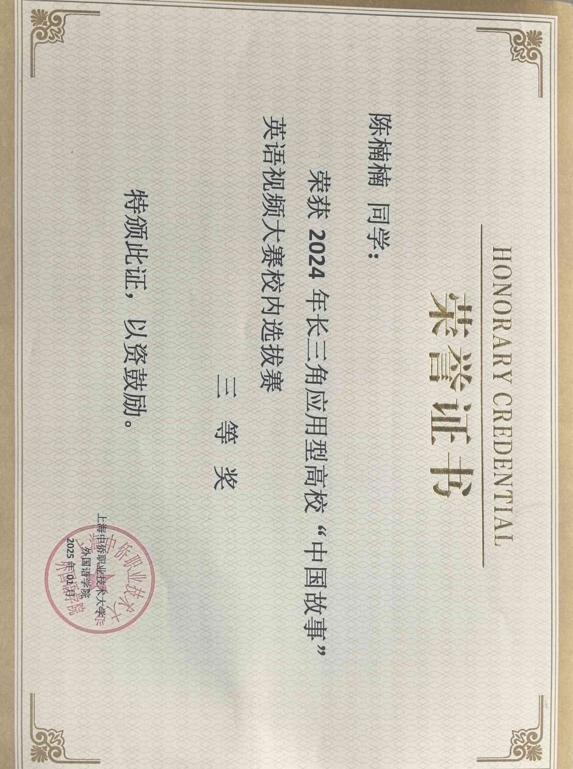 在各类活动中,她参加了院阅读分享会、2024级本科新生军歌合唱比赛、2024年长三角应用型高校“中国故事”英语视频大赛校内选拔赛、院“新生杯”辩论赛、职业规划大赛,并获得2024级本科新生军歌合唱比赛三等奖、2024年长三角应用型高校“中国故事”英语视频大赛校内选拔赛三等奖、院“新生杯”辩论赛亚军。