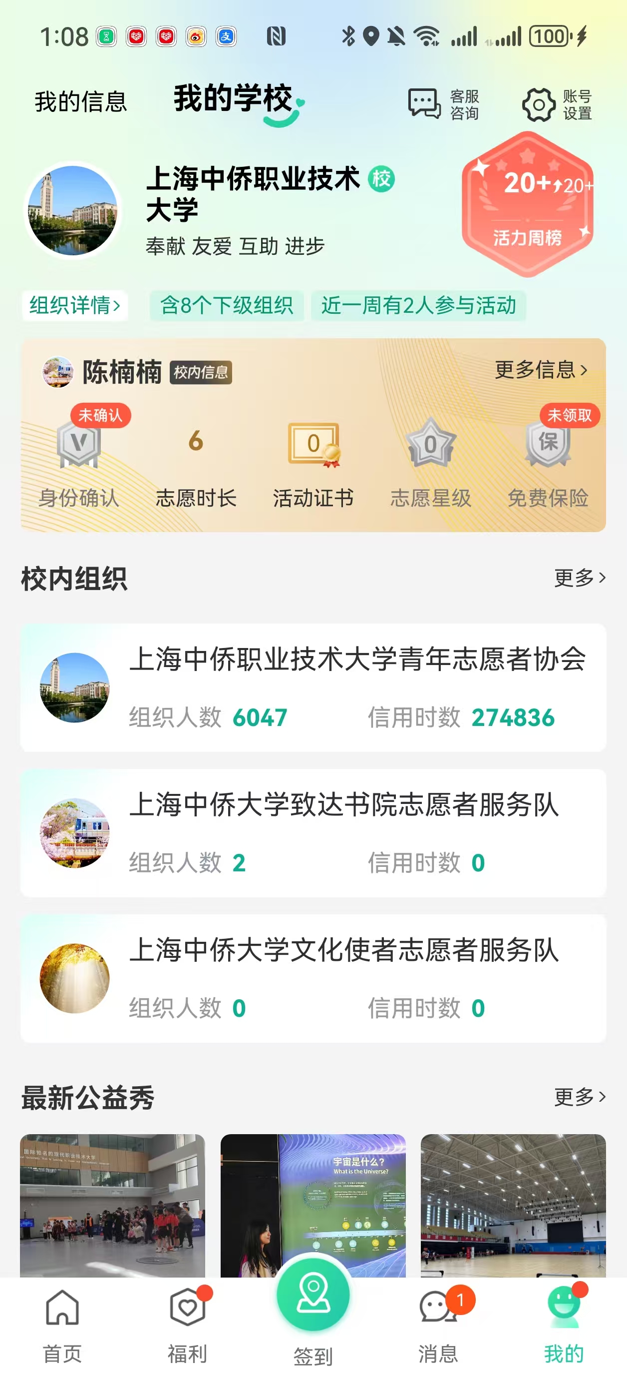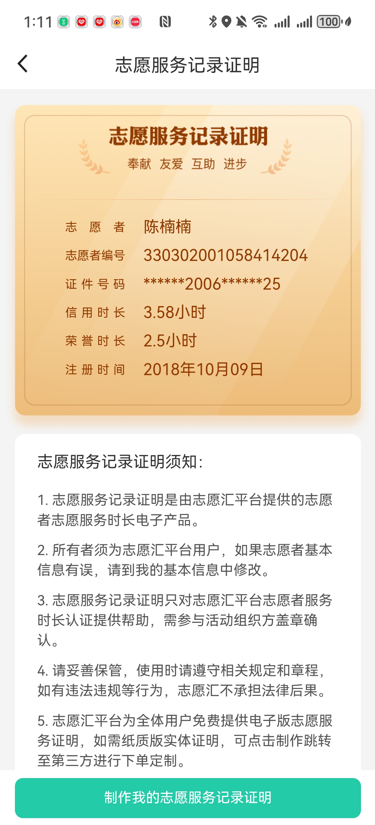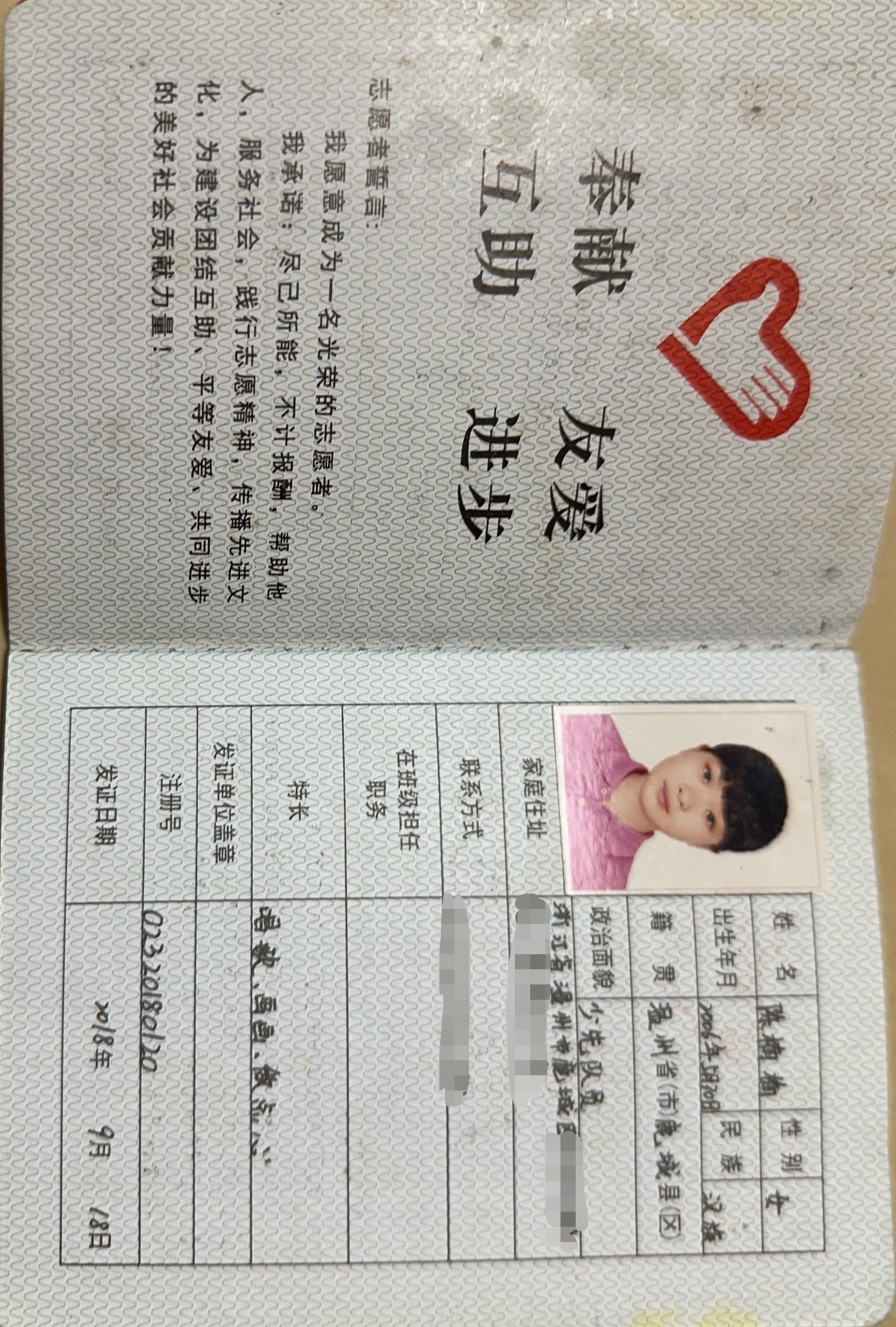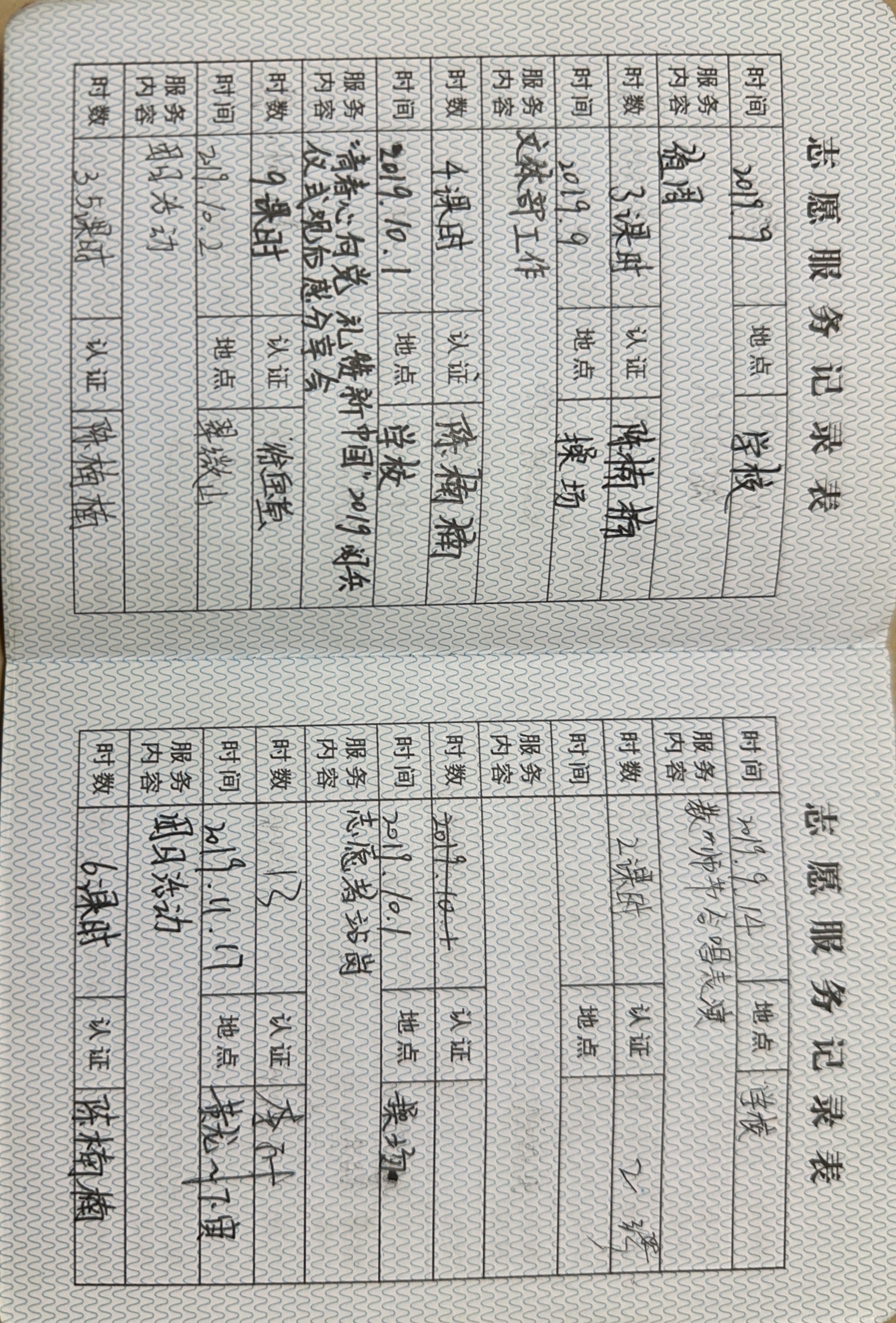 在社会实践与志愿服务中,从小学至初中的每个寒暑假,她都积极参加社区的社会实践活动。此外,她热心公益事业,多次参加学校和班级组织的志愿服务活动。特别是到了初中,成为中队长后,她便积极组织多项志愿者活动。同时,初中施行“每个人都要完成一百个课时”的政策,让她参加了许多次的志愿活动。此外,她还加入文体部,成为一名干事。并获得优秀中队干部、优秀团干、优秀志愿者等多项称号。在初中时,端午送粽子的志愿活动,当她把粽子递到清洁工手中,而他们,先将他们的手在衣服上擦一擦再接过她送出的粽子时,让她懂得关爱他人、奉献社会是她义不容辞的责任。在大学,她参加了上海中心会议保障志愿者的活动。早上六点多起床从学校出发,一直到晚上将近10点才回到学校。在活动中,她积极布置场地,引导相关人员到指定的场所。这些经历让她深刻体会到奉献的快乐,也增强了她的社会责任感。
