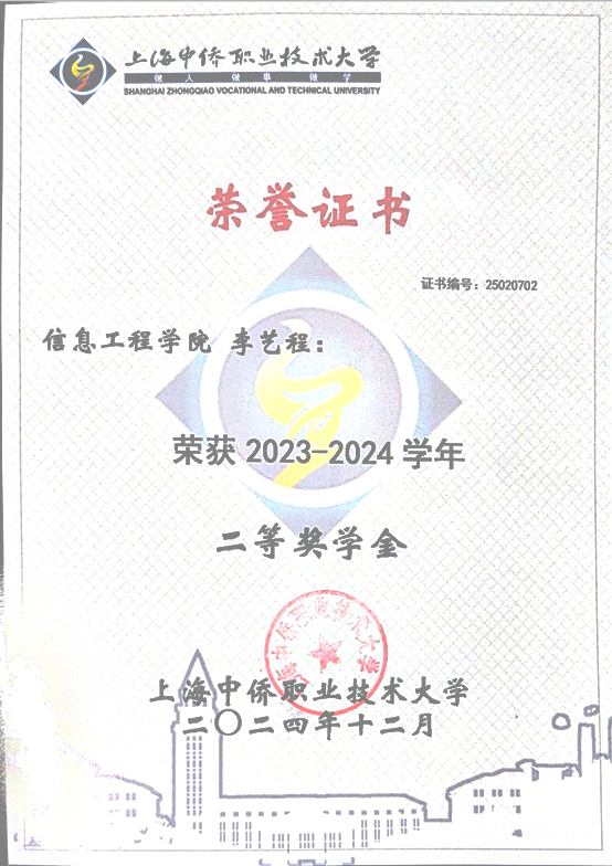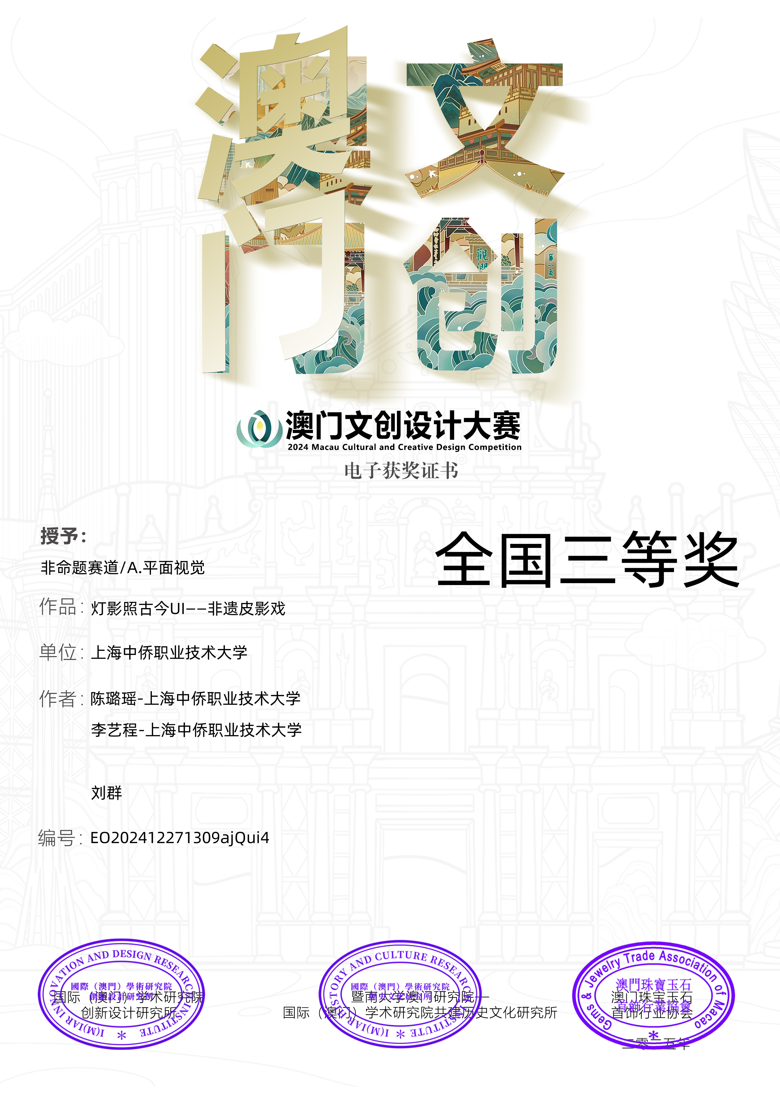 除此之外,他还深刻认识到升学的重要性,于今年3月份参加全国计算机等级考试。在学好专业技能的同时,他力求从全方位不断提升自身的综合素质,积极参加各项比赛,曾获得2024年澳门文创设计大赛全国三等奖,2024年国文奖两岸青年非遗文创大赛三等奖,2024年“知行杯”上海市大学生社会实践大赛乡村振兴赛道高职组三等奖(红色赋能项目),2024年“知行杯”上海市大学生社会实践大赛乡村振兴赛道高职组三等奖(数智兴农项目)等荣誉。