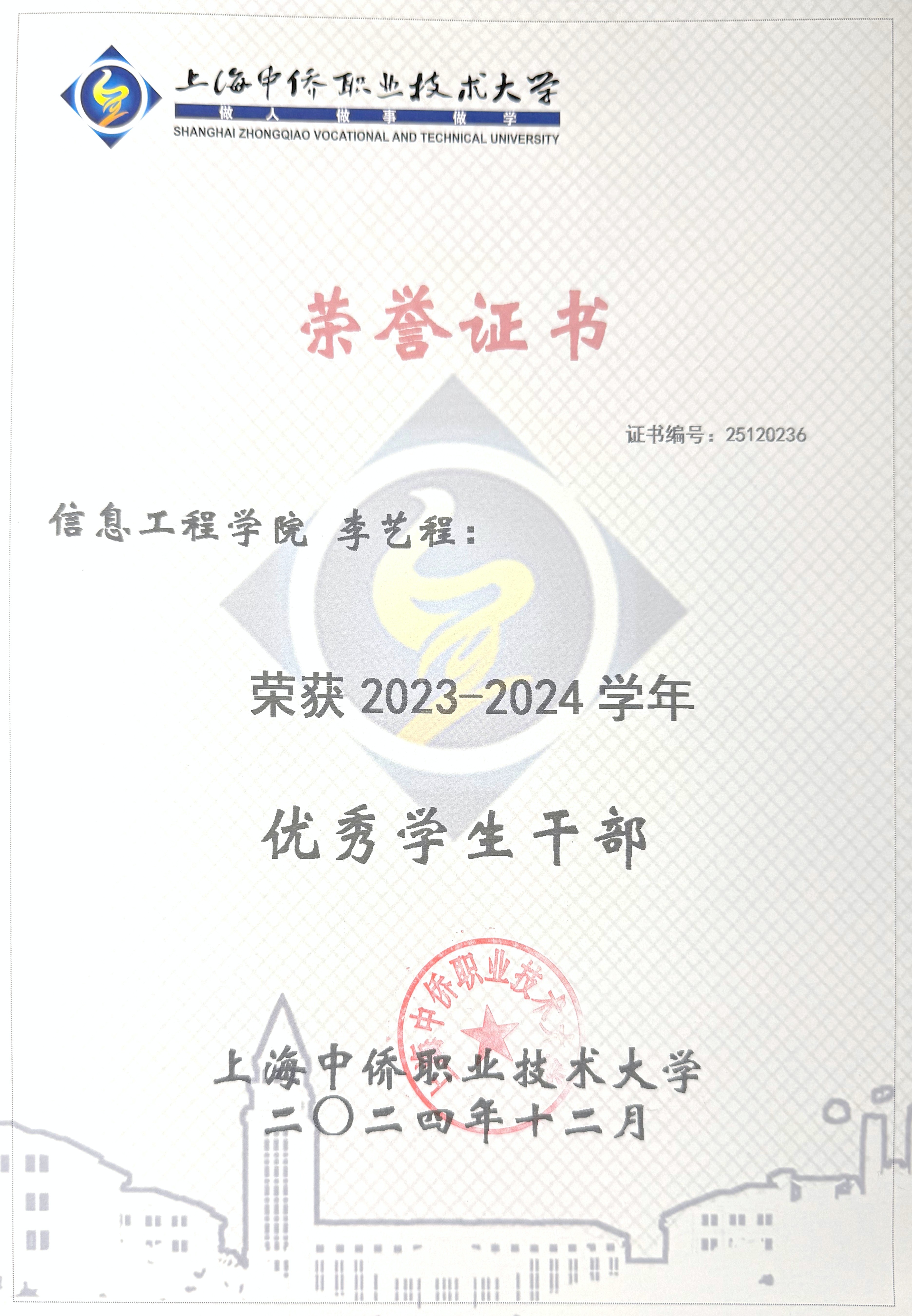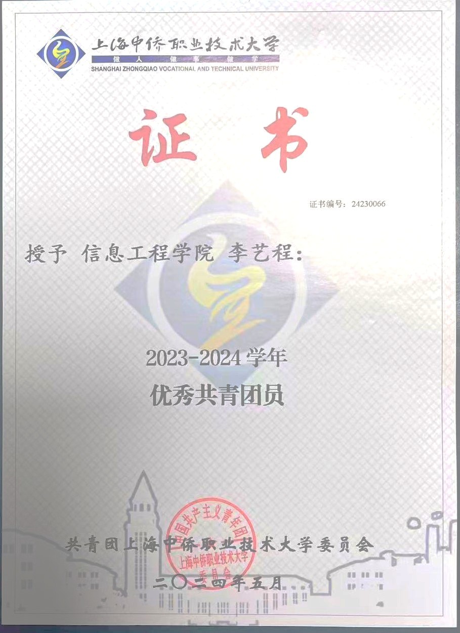 李艺程,男,汉族,是上海中侨职业技术大学信息工程学院23级数字媒体技术专业1班学生,现任班级班长,兼信息工程学院主席团成员职务。作为学生,李艺程同学有计划地学习专业知识,积极参加各种活动;作为学生干部,他团结同学,敬爱师长,深入细致的做好各项本职工作,是同学们的好榜样,老师的好帮手。
