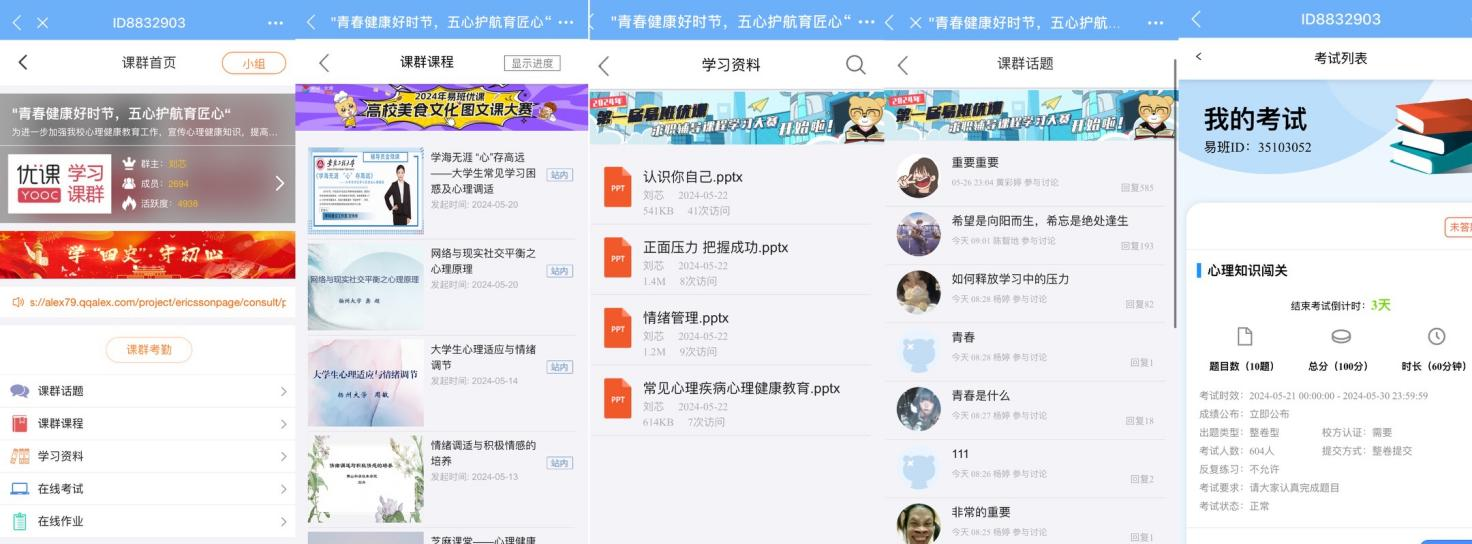 为进一步加强学生心理健康教育工作,宣传心理健康知识,提高学生自我心理保健的意识,我们联合校心理健康教育中心,利用“5·25”心理健康主题宣传月为契机,以线上加线下的方式,在全校范围开展了“青春健康好时节,五心护航育匠心”易班优课系列活动。