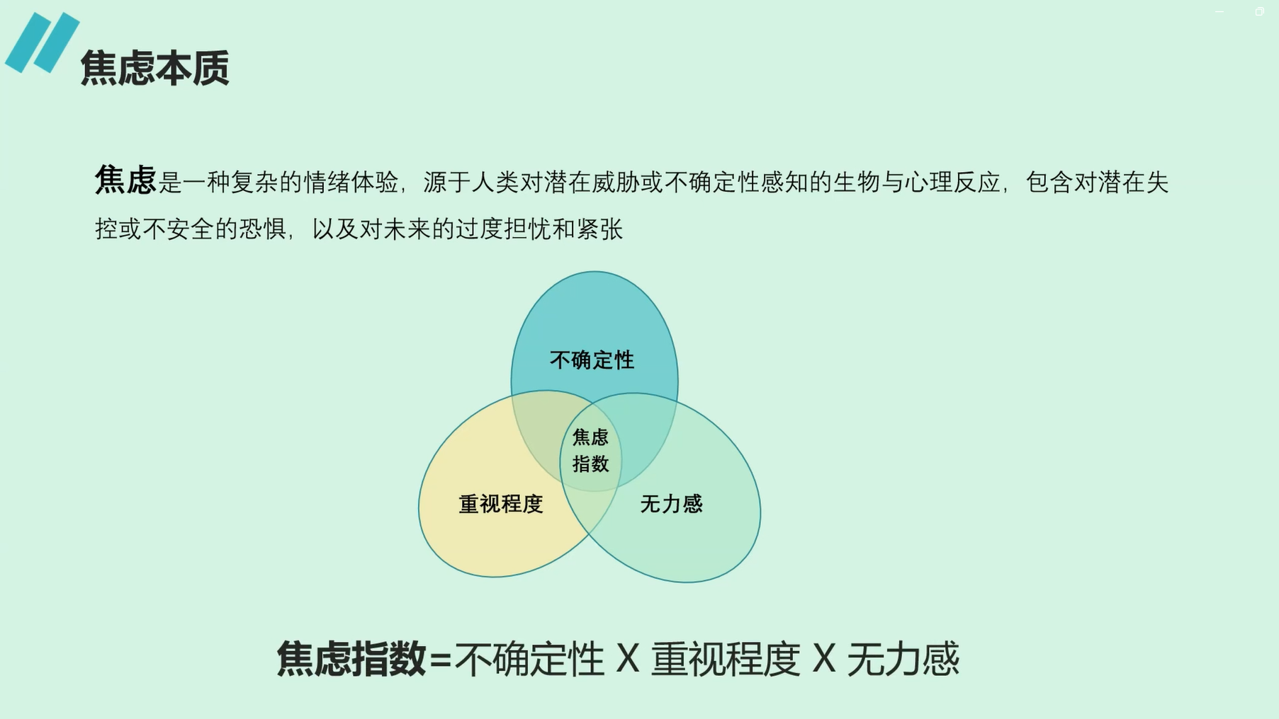 但别担心,让我们一起学习如何拆解这些*。要拆解焦虑,我们得先了解它的本质。焦虑是一种复杂的情绪体验,源于人类对潜在威胁或不确定性感知的生物与心理反应,包含对潜在失控或不安全的恐惧,以及对未来的过度担忧和紧张。