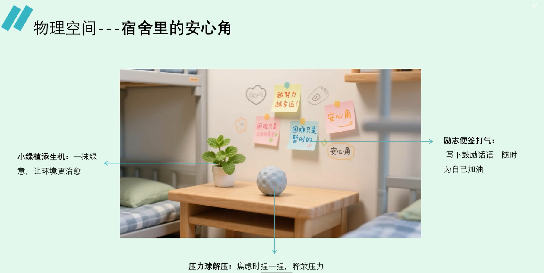 在物理空间方面,大家可以在宿舍打造一个 “安心角”。放一个压力球,感到焦虑时捏一捏,释放压力;贴上一些励志便签,写下鼓励自己的话语,随时给自己打气;再摆上一盆小绿植,让环境更有生机。