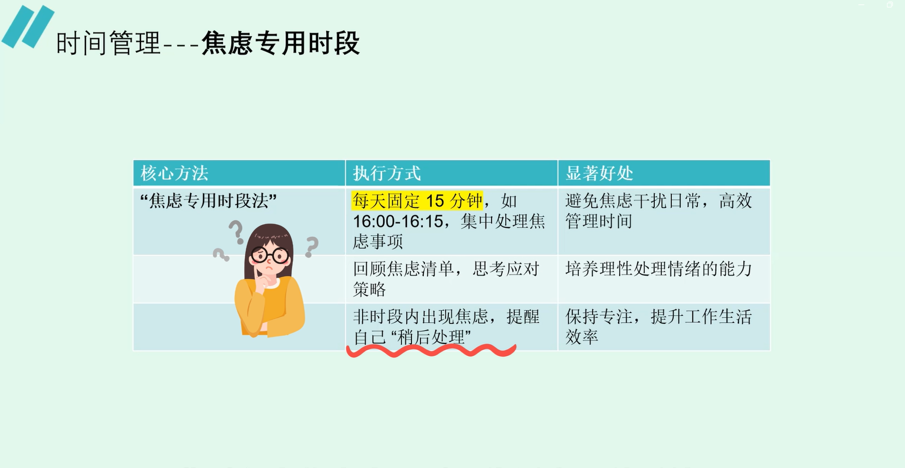 最后是人际维护,建议成立 “互助拆弹小组”。课后自行组队,每周交流一次,分享应对焦虑的经验与困难。同伴的鼓励和建议能带来启发,良好的人际关系是缓解焦虑的有效方式。