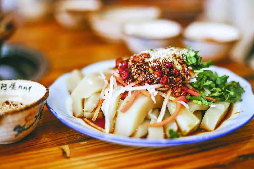 转角处,黝黑发亮的鸡豆凉粉在案板上颤动。这种用高原特有鸡豆制成的凉粉,暑天凉拌酸辣醒神,寒日油煎外脆内滑,灰绿色的质地藏着八百年未曾中断的古早味。
